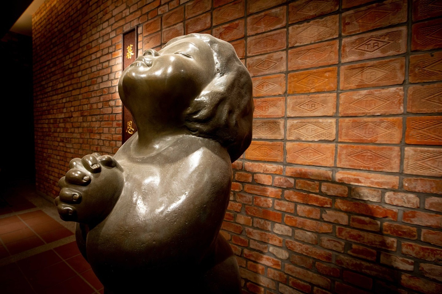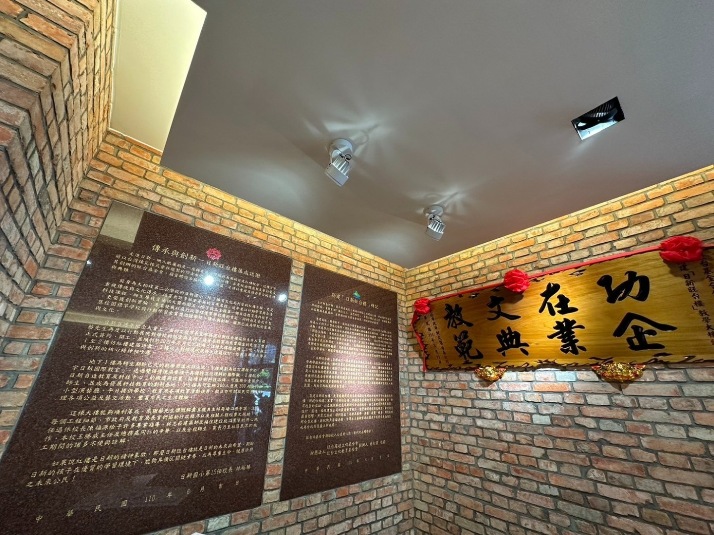 以產自印度紅花崗石製作。 "朝念父志 暮思母恩" 的對聯,這是蔡衍榮董事長督促自已的指標,也是盼望能啓發這麼多莘莘學子對這塊土地的熱愛以及莫忘父母的恩情。背後牆面由蔡合源冷凍廠的 T.R 磚砌成,這呈現出創辦人以及日新國小這之間神奇又美好的連結與緣份。