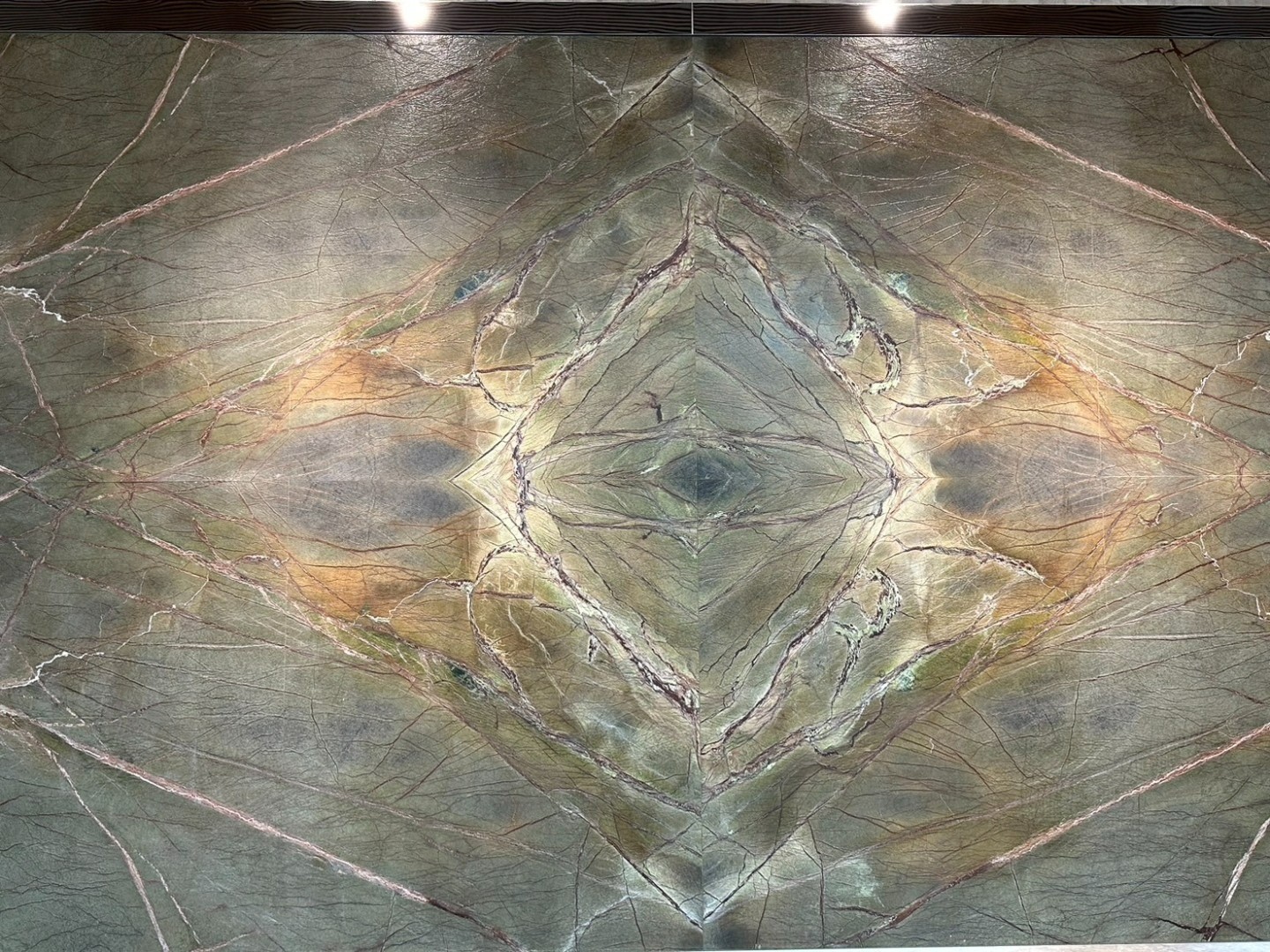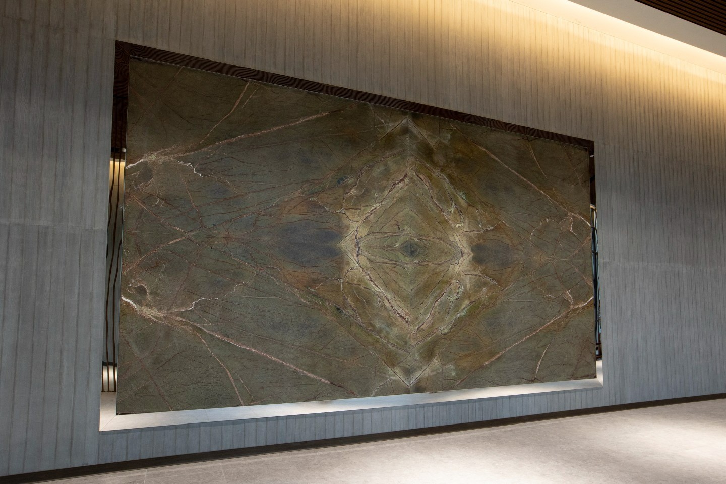 產於印度的天然綠色大理石,以精湛工藝裁切,對花紋理呈現。用特製鋼刷刨除雜質並以同時水柱磨洗造成深淺立體的自然表面,歷經數不清年代的地層擠壓,樹木的化石也融入其中,與石材共同形成特殊的紋路, 石材紋理猶如夏樹的銀花,特殊處理的表面觸感實有撫摸樹木的反饋。混然天成的組合,躍上清水模牆面,添增大度的氣勢。