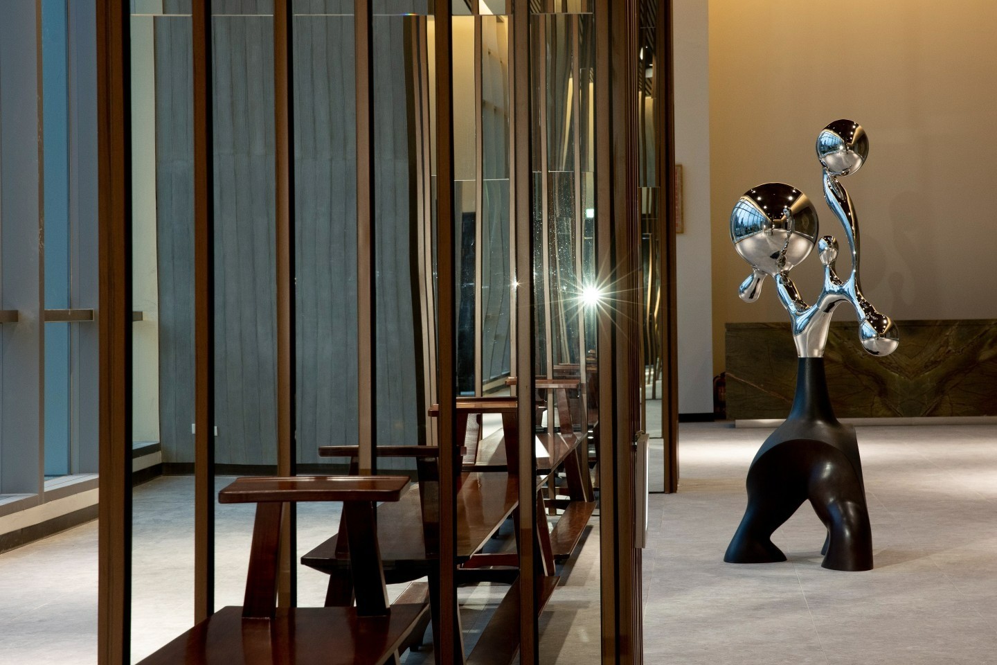 看似冰冷、堅硬的不鏽鋼雕塑,以流線的球體造型呈現拋光如鏡面的表面,變形卻清晰地反映出周圍景物,可轉動的關節相互連接,若是舞動出不同的軌跡,與週遭環境形成有趣的對話關係。